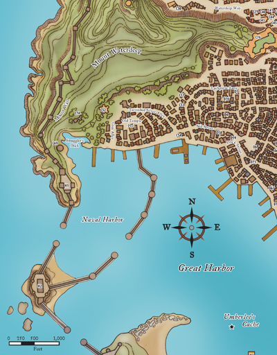 Castle Ward: Castle Ward, at the center of the city, includes fount Waterdeep, its castle, the Palace of Waterdeep (occupied by Piergeiron), and the homes of some prosperous Waterdhavians.