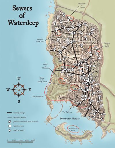 Skullport (Large Town, 2,123): The dark twin to Waterdeep's light soul, Skullport is a subterranean city connected to both Undermountain and a great sea in the Underdark. Skullport is tolerated, barely, by the Lords of Waterdeep, because the madness and chaos it houses might otherwise rise to the surface and destroy the City of Splendors. Agents of Waterdeep monitor the city's buried twin and sometimes carry out missions here, but they generally refrain from acting unless Skullport's denizens plot against the city above.
