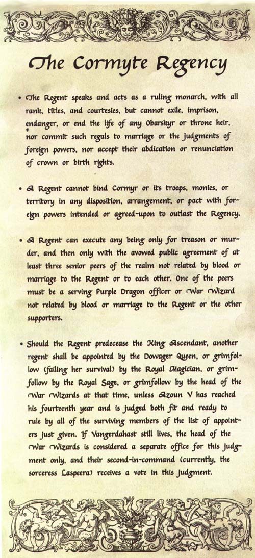 The rules governing this Regency were crafted by Vangerdahast in light of the actions of Salember the Rebel, who refused to surrender the realm to the rightful Obarskyr, Rhigaerd, and in brief are described to the left.