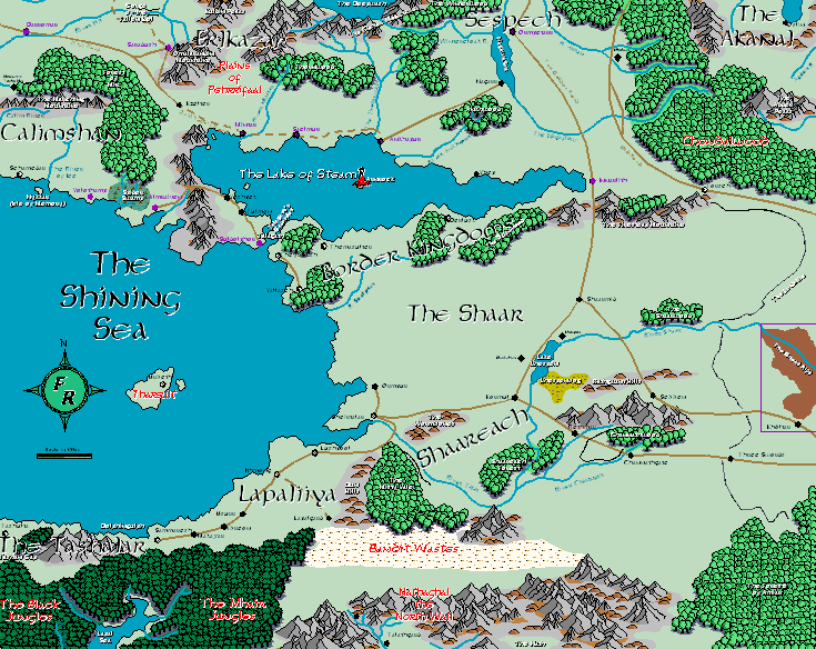 South of the Lake of Steam on the eastern shores of the Shining Sea lies, the fractious kingdom of Lapaliiya, a crossroads land between the Shaar plains, the Chultan jungles, and the verdant Lake of Steam.