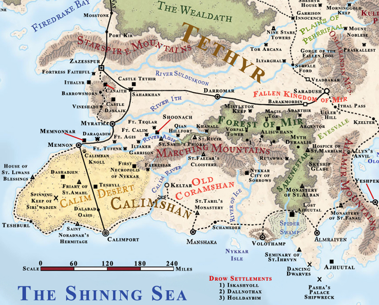 Calimshan extends along the northern coast of the Shining Sea for more than five hundred miles and includes all land south of the River Agis and the Marching Mountains.