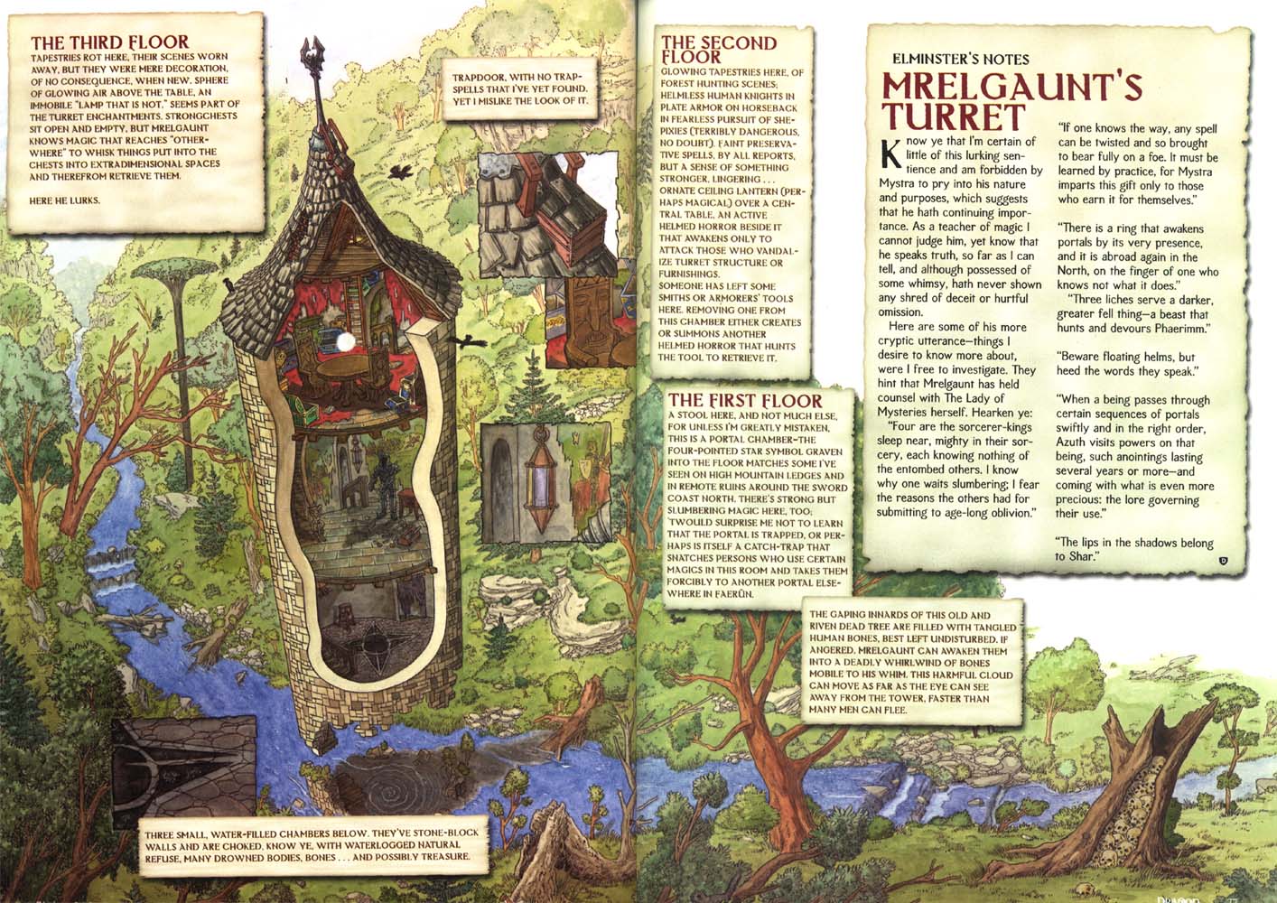In a wooded ravine northeast of Everlund, above a small, nameless stream, floats a foresters' landmark few have seen. Mrelgaunt's Turret is a crumbling tower lacking its lower levels - they've fallen away to leave the upper floors held aloft by enchantments that could fail at any time.