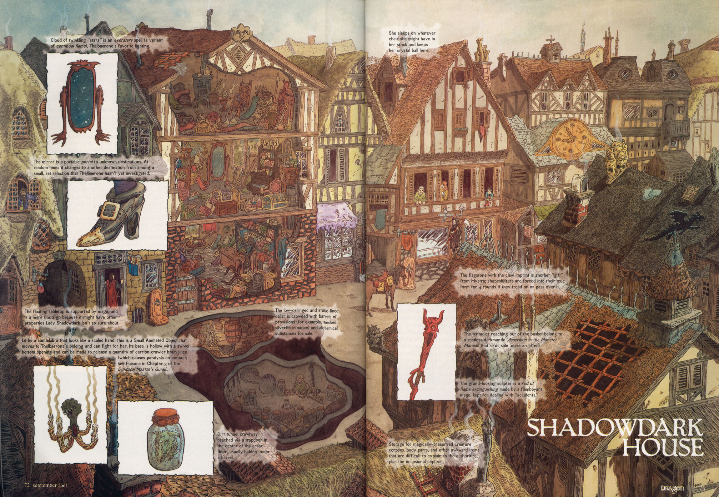 Beings of all sorts who enter the dim, cluttered interior of Shadowdark House find an ever-changing miscellany of magic for sale; in other words, beyond light stones (stones bearing continual flame enchantments, sold in carved, slide-apart, two-piece stone sheaths) and cure light wounds potions, the stock is unreliable and can range from a small armory of enchanted daggers to pieces of furniture that speak whenever moved. Oddities with several powers (some hidden and some that will be exhausted after only a few uses) are the rule, and prices range from 600 gp to 200,000 gp, with average prices in the mid-thousands.