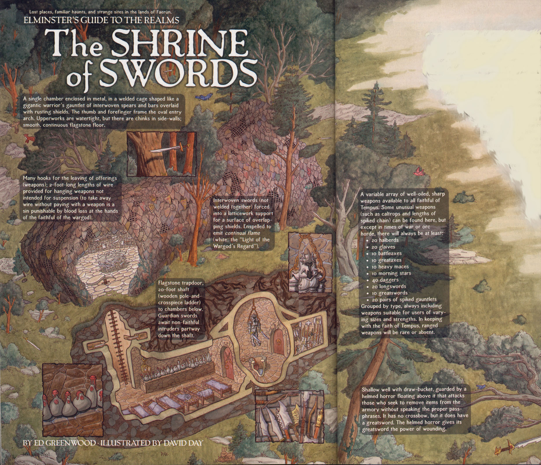 Visitors will see a lone dome-like chamber made of used armor and weaponry welded together in the shape of a gigantic gauntlet or armored hand. The structure encloses a glowing altar fashioned of shields, which is supported by a network of interlaced swords upon a flagstone floor. The place provides spare accommodations, but it is available for a day and night to all who make offerings of weapons, and it often provides vital protection against pursuing brigands or wolves, for no one can draw blood within the sanctified area of the shrine, save in a ritual dedicated to Tempus, without awakening the seven animated blades that guard the shrine. Any priest of Tempus within sight of the shrine can mentally command the blades to strike in accordance with his or her will (as a free action, but the character can only select targets for the blades, not control them otherwise).