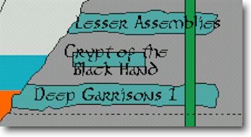 [4] Both the Crypt of the Black Hand and the cistern gate leading to it survived the devastation wrought by the Gatekeeper's Crystal. The cistern gate is found within one of the lesser assemblies, as mapped in the Hellgate Keep module. The Crypt of the Black Hand lies encased in solid rock between the Lesser Assemblies and the upper level of the Deep Garrisons, again as mapped in the Hellgate Keep module. The Black Hand Gate is bi-directional, with passage from the Crypt to the cistern triggered by a matching right hand indentation carved into the center of the floor of the pool in the Crypt. The gate is warded against the passage of creatures native to the Lower Planes, and thus the Crypt has never been breached by the demons of Hellgate Keep. The air within the Crypt of the Black Hand is kept fresh by magical means, and the torches are lit by magical flame that cannot be extinguished, except by a successful detect magic spell.