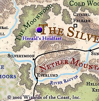 A day's rough journey north and west of Silverymoon (or south and west of Quaevarr), the Herald's Holdfast is within an isolated dell hidden in the southern eaves of the Moonwood. A short stone tower (more like a fortified manor house than a genuine stronghold) squats in the dell like a misshapen woodland idol. Three-quarters of the tower is set against the slope of a steep hill that surrounds the dell. Only one door is set into the tower wall, and it is a moss-covered stone portal worn smooth by time and use. So well concealed is the tower within its wreath of vegetation that even those who know what they are seeking must make a Spot check (DC 20) to identify the tower, and a Search check (DC 20) to locate its single entrance. The tower door remains unlocked at all times, and it swings open freely to the touch.