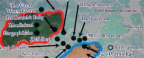 Famed home of the drow adventurer Drizzt Do'Urden, Menzoberranzan is cosmopolitan as far as drow cities go. Numerous tunnels bring trade from other Underdark realms and occasionally from the surface world. Outsiders are not welcome in Menzoberranzan, but they are grudgingly tolerated. However, there is no room in the city for those drow who do not obey the Queen of the Demonweb pits and her powerful matron clerics. Those drow who dare make a show of disobedience, or whose clandestine acts of disloyalty are discovered, suffer a terrible fate at the hands of those who wield power.