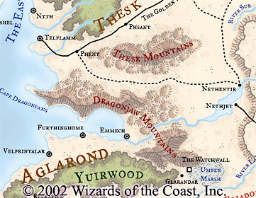 - The Golden Way, the trade route between for Kara-Tur and Faerûn, ends in Thesk. It is a prime target for bandits, and some people notice a sudden rise in bandit-related activity. The characters are asked to patrol the region and keep the bandits from attacking the next caravan due in two days. Bandits do take the caravan, but they don't keep their wealth for long. The bandits have a lair in the Thesk Mountains, and the dragons of the Dragonjaws steal the stolen loot from the bandits' hideaway. The characters have to find the lost loot to prevent a major problem in the area, and the trail becomes quite complicated.