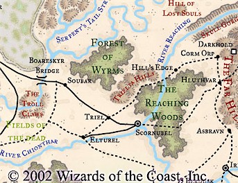 The forest is very close to the Trade Way, the main trade route from Waterdeep to the Inner Sea. It is also within a day's dragon flight from the Serpent Hills and the High Moor. For all these reasons, the location was practically irresistible to Valraxaxath. The portal here is deep within the forest itself, marked by two large trees and set high in the branches so that flying dragons can use it easily. As a consequence, one has to fly to use the portal. It is double-sized, but it can accommodate most dragons. Like the Small Teeth portal, it is a variable portal that requires keys. It can be used four times per day.
