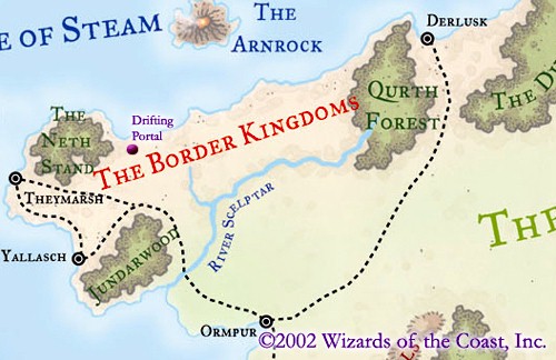 Glethsheven Rimmisk (LN male human Ftr16/Clr2), one of the many adventurer monarchs of the Border Kingdoms, hired Jhaurmael to create the drifting portal, which is one of Jhaurmael's first portal creations. Rimmisk was a latecomer to the worship of Helm in his life, but he took to the faith with all the uncomfortable zeal of a recent convert. He had recently decided to settle in the Border Kingdoms and stake his kingdom as a new staging ground for Helm's protection of the poor, weak, and young.