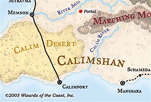 The portal created by Yrrick in Faerûn can be found near Calimshan, where air genasi are most common. It is keyed to allow only genasi to activate it, and it remains open for 1 round after activation. The portal in the refuge is in the central region, which Yrrick fashioned to look like a temperate part of Faerûn. A sign greets those emerging from the portal and informs them that they have entered the Genasi Refuge, where all genasi are welcome.