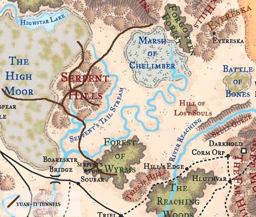 In the midst of the Serpent Hills, astride the upper reaches of a small river that feeds the Serpent's Tail Stream, the petrified body of a gigantic serpent lies mostly buried in the ground. One coil of the creature's immense corpse forms an arch over the stream, while its head and tail protrude from the rocky ground some 500 feet apart.