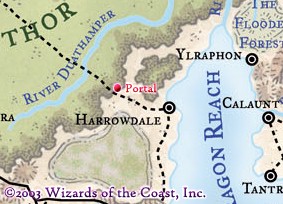 Where the mighty Cormanthor Forest meets the fertile plains of Harrowdale, Torm placed his portal -- a place where his forces could deploy rapidly into the Dalelands when evil dared show itself. An unusual couple of trees that were grown into an archway, just 30 yards north off the Halfaxe Trail, barely into Cormanthor's forest, is the chosen locale.