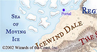 Long ago, this island was the tip of a peninsula extending westward from what is now called Icewind Dale, and a great city stood on its heights. The peninsula now drowns beneath the freezing waves, and the city is long forgotten. All that remains are the weathered remains of what was once a fine structure formed of magic stone, and the remnants of this structure barely support the magic of a portal in the air above the sinkhole.