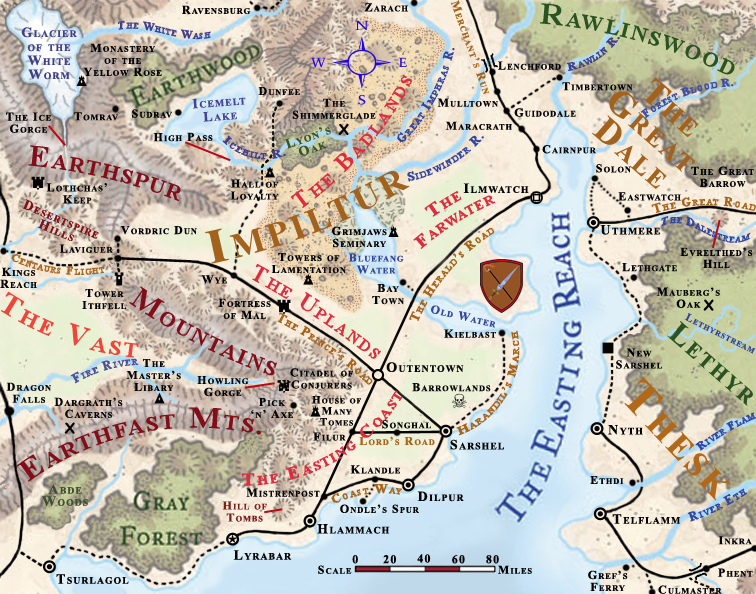 Earthspur Mountains: These tall peaks mark the western border of Impiltur, running from the Moonsea south to the Sea of Fallen Stars. A constant cold wind from the Glacier of the White Worm that tests at their center howls through the peaks. There are few trails and many monsters, but the Earthspurs are rich in gold, silver, and bloodstone. Mining communities survive here, although the dangers of the mountains contribute to a high mortality rate. Persistent rumors speak of a hidden pass leading from Impiltur west to the Vast, but no such route has ever been mapped.
