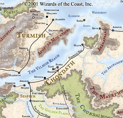 Along the Vilhon Reach, the population repeatedly outstrips even prodigious local crop yields. As a result, the Vilhon has been the source of many wars, and the cradle of mercenaries and merchants who seek their fortunes elsewhere. Chondath was created in 144 DR by the spreading influence of the rich city of Arrabar, whose lords built the Emerald Way trade road to Shamph and eventually to Hlath.